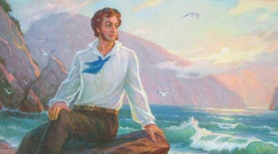 «Вот Чатырдаг», - сказал мне капитан. Я не различил его, да и не любопытствовал. Перед светом я заснул. Между тем корабль остановился в виду Юрзуфа. Проснувшись, увидел я картину пленительную: разноцветные горы сияли; плоские кровли хижин татарских издали казались ульями, прилепленными к горам; тополи, как зелёные колонны, стройно возвышались между ими; справа огромный Аю-даг… и кругом это синее, чистое небо, и светлое море, и блеск и воздух полуденный…