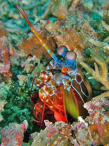 Угрожающие жесты раки видят издалека: у них отлично развиты органы зрения. Сложно устроенные фасеточные глаза богомола состоят из 10 000 фасеток. Видеть под водой не так просто, и если у человека всего 3 колбочки для восприятия цветов, то у некоторых раков-богомолов их не менее 8 – из них три чувствительны к ультрафиолетовым лучам. Плюс еще 4 фильтра для тонкой настройки.