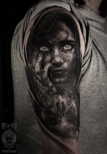 Стиль хоррор – это нанесение на кожу изображений героев и сцен из фильмов ужасов, а также других «жутких» картин. История стиля Нельзя точно сказать, когда сформировалось хоррор-направление в тату-искусстве. Как только на экраны стали выходить «ужастики», появились и их поклонники. Особенно смелые стали заказывать татуировки с любимыми персонажами. В дальнейшем этот стиль развился и вобрал в себя и другие сюжеты. Отличительные особенности В стиле хоррор можно разработать практически любой эскиз, а затем воплотить в виде красочной тату. Это направление допускает использование любых техник и их сочетаний. Главное – рисунок. Однако самые популярные – татуировки в технике реализм, которые до жути достоверно воссоздают детали. Хоррор – одно из тех направлений, которые не терпят ограничений. Тату можно сделать на любой части тела, в любых цветах. Обычно это изображения в насыщенных темных тонах с выразительными контрастами. Популярны также и черно-белые. Характерный дизайн В интернете, ка