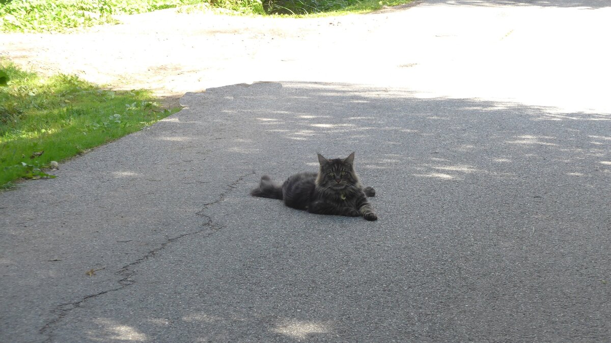 Понятно, что кот, но уж очень большой, как два обычных кота. Приближаюсь и вижу - разлёгся котяра посреди дороги. Башка, как у тигра, и кисточки на ушах. Пригляделась - мейн-кун. Цвета тёмный шоколад. Вальяжен, шикарен, не пуглив.