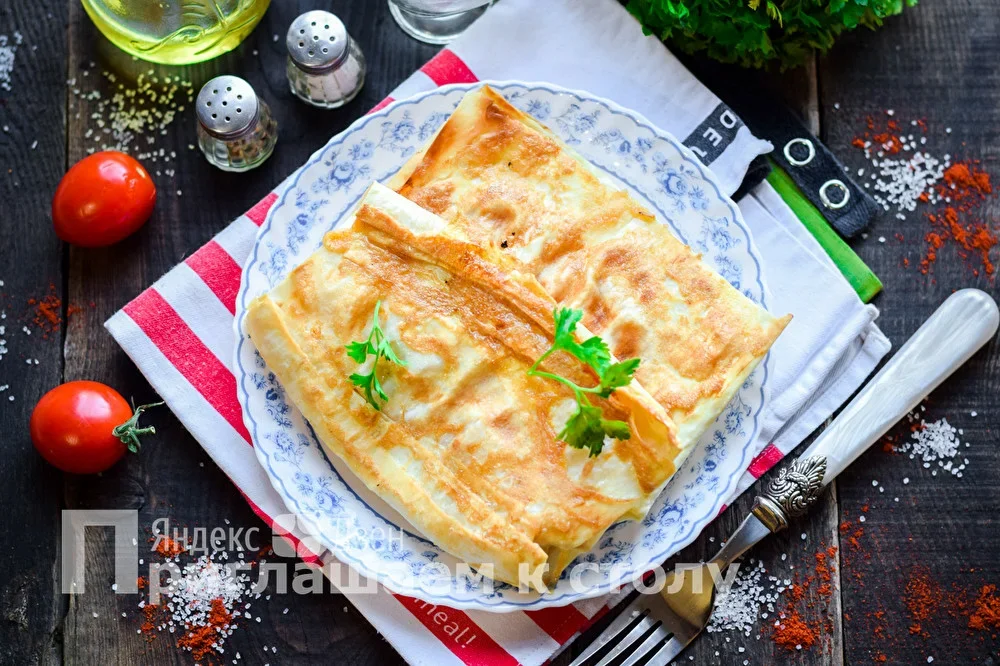 Тонкий армянский лаваш нарезаем на одинаковые порционные кусочки-квадратики.