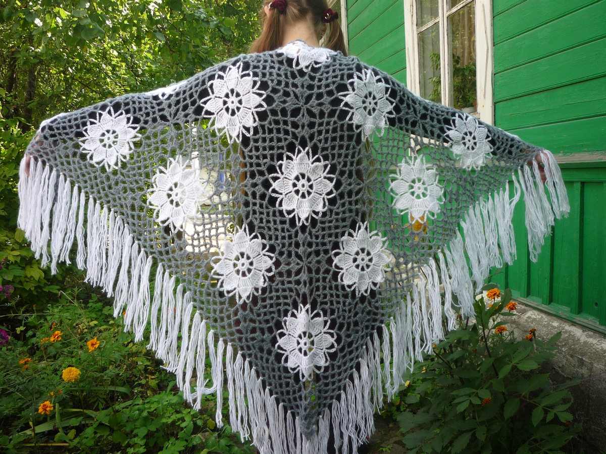 Приветствую всех гостей и подписчиков моего канала! Я люблю творчество. Занимаюсь различными видами рукоделия: вязание крючком, спицами, различные виды вышивки, бисероплетение, макраме, фриволите. Всегда в поиске чего-то нового, интересного и необычного. Как и любая рукодельница, я люблю хвастаться своими работами. У меня их много. Я вяжу на заказ, продаю в сувенирных лавках. Далеко не все свои работы я фотографирую. Но, тем ни менее, уже скопилась небольшая коллекция фотографий. Я обязательно познакомлю вас со всеми своими работами в будущих статьях. А сегодня мне хочется похвастаться своими шалями и палантинами. Схемы для своих шалей я беру в журналах или на просторах интернета, благо выбор огромный. Но, я уже писала ранее, что я человек творческий и не могу вязать строго по схеме. Мне все время хочется привнести в свои работы что-то свое. Поэтому я часто меняю схемы по своему усмотрению. Например для этой шали я взяла схему в журнале "Золушка вяжет". Это был обычный квадратный мот