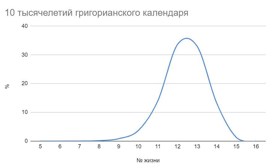 Да как это вообще работает? Как небесная канцелярия распределяет рождение по номерам? Начнем разбираться. Перед вами гладкая диаграмма за 10 тысячелетий григорианского календаря в процентном соотношении, где горизонтальная ось - номер реинкарнации,