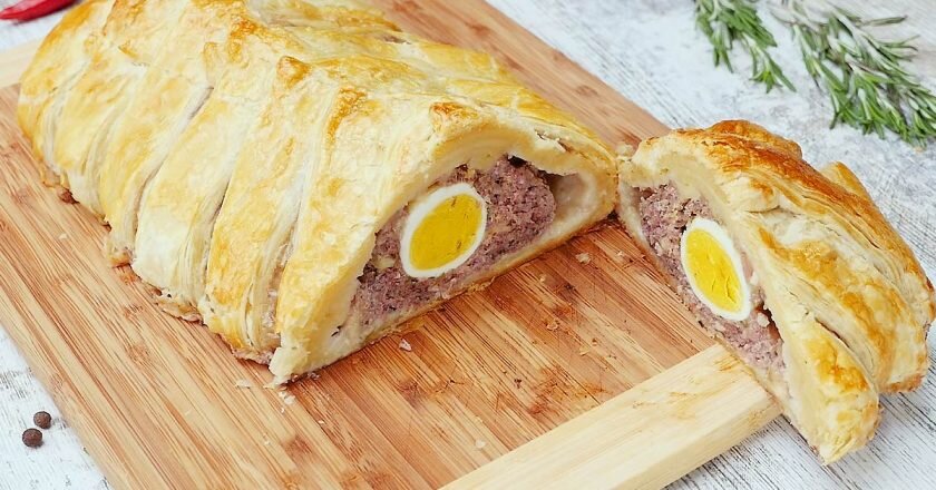 - Раскатайте слоёное тесто в один лист, положите на лист, застеленный пергаментом. Выложите на тесто половину мясной начинки, затем половину моцареллы, потом 4 очищенных варёных яйца. Далее пойдёт слой оставшегося сыра.