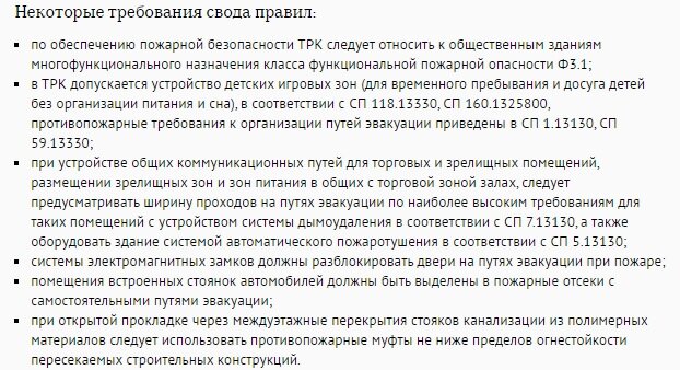 В июне текущего года вводятся в действие несколько важных сводов правил, которые мы постарались разобрать на предмет требований пожарной безопасности. СП 464.1325800.2019 «Здания торгово-развлекательных комплексов. Правила проектирования» Введён впервые. Внесён в добровольный перечень «Технического регламента о безопасности зданий и сооружений». Дата начала действия: 03 июня 2020 г. Прежде всего отметим, что вводная часть свода правил сообщает о его применении и для соблюдения требований «Технического регламент о требованиях пожарной безопасности» (но в соответствующем перечне данного СП нет). СП 460.1325800.2019 «Здания общеобразовательных организаций дополнительного образования детей. Правила проектирования» Введён впервые. Внесён в добровольный перечень «Технического регламента о безопасности зданий и сооружений». Дата начала действия: 11 июня 2020 г. Некоторые требования свода правил: подъезд пожарных автомобилей к зданию должен быть обеспечен со всех сторон; ширину дверей в свет