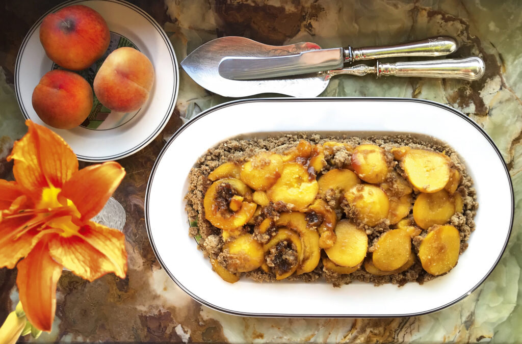 - Выложите персики в форму, посыпьте крошкой и запекайте, пока корочка не станет золотисто-коричневой – примерно 30–35 минут. Подавайте теплым.