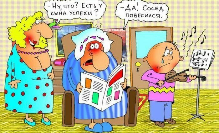 1. Жильцы въезжают в новый дом, знакомятся. Один сосед говорит другому: - Степа, а давай проверим звукоизоляцию стен. - Хорошо Ваня, давай. Уходят в свои квартиры. Один кричит: - Степа, ты меня слышишь? - Не кричи Ваня, я тебя вижу! 2. Слуга говорит соседу своего хозяина: — Мистер Джонс передает вам привет и сообщает, что он застрелил свою собаку, которая воем и лаем не давала вам спать. Сосед: — Я признателен мистеру Джонсу. Спросите его, не будет ли он настолько любезен отравить еще свою жену или хотя бы сжечь ее пианино? 3. У еврея горит дом. Все вокруг мечутся, тушат пожар, и только сам хозяин стоит с безразличным видом, засунув руки в карманы. Подбегает сосед: - Абрам, твой дом горит, а ты стоишь! - А что я должен делать? - Такое несчастье - да ты волосы на себе рвать должен! - А может, я этим и занимаюсь?! 4. -Жена, ты слышал, у наших соседей ребенок родился? — Ну, какая это новость, Ваня! При наших тонких стенах, я могла тебе это еще 9 месяцев назад предсказать! 5. Мужчина