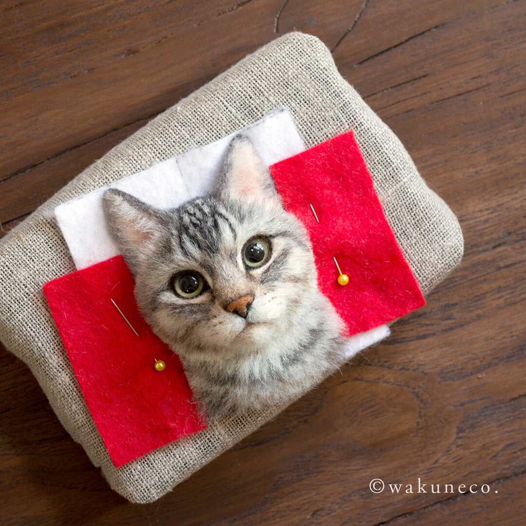 Японская художница Вакунеко создает невероятно реалистичные портреты кошачьих голов, изготавливая вручную трехмерные творения техникой валяния из шерсти (фильцевание). Работы Вакунеко сделали ее очень популярной на YouTube, где она публикует видео с практическими рекомендациями по созданию таких удивительных кошачьих мордочек. Художница черпает вдохновение из фотографий и видео настоящих кошек, которые абсолютно различны по породе, окрасу, возрасту и повадкам. Она продает свои скульптурные объекты на аукционах Yahoo!, но в настоящее время доставка осуществляется только в пределах Японии.