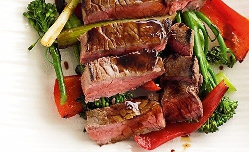 ИНГРЕДИЕНТЫ: 2 стейка по 250 грамм толщиной не менее 2 см. ПРОЦЕСС: Поместите стейки в неглубокую емкость, полейте соусом терияки и приправьте свежемолотым черным перцем.2. Оставьте мариноваться в холодильнике на 4-6 часов, периодически переворачивая. Чем дольше время маринования, тем интенсивнее и нежнее будет вкус готового блюда.3. Достаньте стейки из холодильника и подождите пока они «потеплеют», я имею ввиду пока они не станут комнатной температуры. Хорошо разогрейте сковородку, но не до раскалённого состояния. Обжаривайте замаринованные стейки на протяжении 2-3 минут с каждой стороны. Таким образом будет достигнута прожарка medium rare. Готовые стейки свободно оберните фольгой и оставьте их «отдохнуть» на протяжении 10 минут.4. Протрите сковороду бумажной салфеткой и вновь нагрейте её до умеренной температуры. Обжаривайте овощи на оливковом масле в течение 5 минут, не забывая периодически помешивать. Овощи должны быть оставаться немного хрустящими внутри. Добавьте 1 столовую лож