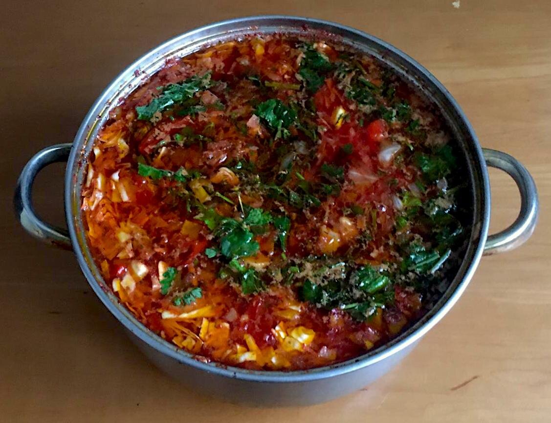 Борщ я варю очень редко, но – метко. Этот процесс у меня всегда занимает минимум 4 часа, и без всяких там стеснений, могу сказать что этот супчик получается у меня отменным. Как я всегда говорю: в супе главное – бульон. Гуд бульон - гуд суп, ноу гуд бульон – ноу гуд суп. Он (бульон) должен быть насыщенным, ароматным, кляксы из жира должны плясать на поверхности... Я не собираюсь вас учить как варить борщ - уверен, что многие из вас готовят это блюдо лучше меня и по большому счёту, нет никакого универсального рецепта борща – у каждого он свой. Я просто расскажу, как варю его я. Итак: На подготовку бульона у меня уходит более трёх часов. Я сразу варю в одной кастрюле шикарные говяжьи кости, кусок телятины (вырезку) и кусок свинины (предпочитаю лопатку) и захерачиваю туда же корни кинзы, сельдерея и петрушки. Вроде бы маленькая вещь, но эти три компонента придает бульону волшебный аромат. Для "золотистости" я кладу в кастрюлю целую луковицу в шелухе. Солю совсем немного – только для тог