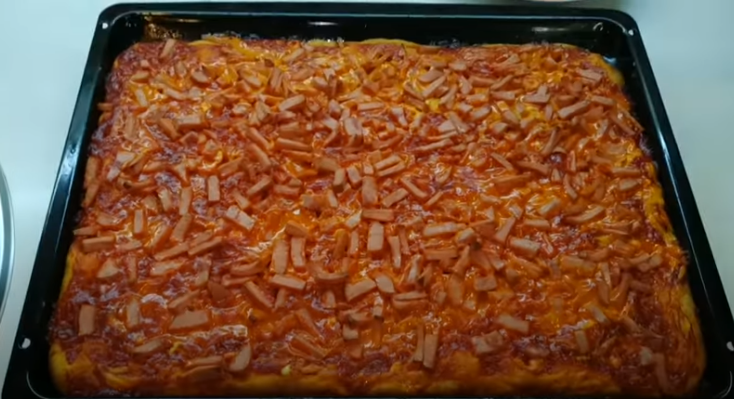 Готовим быструю пиццу из заливного теста. Для теста 1- стакан кефира 2- стакана муки 2- яйца 1чай.л сахара 0.5 чай.л соды 0.5 чай.л соли Выпекать при 180 градусов 25-30 минут.
