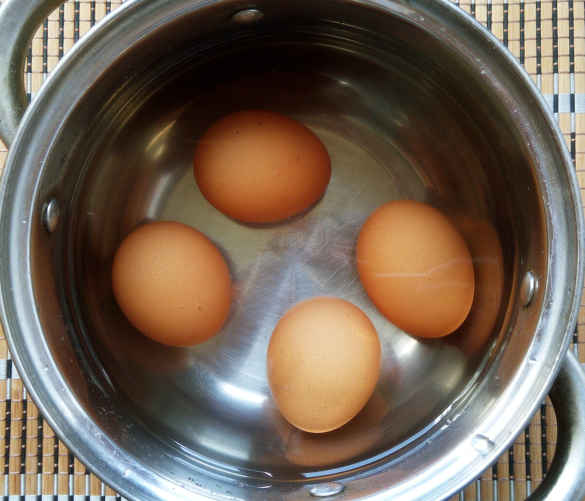 1. Четыре куриных яйца среднего размера аккуратно вложить в сотейник, после чего влить достаточный объем кипятка. Накрываем крышкой, устанавливаем большой огонь и отвариваем на протяжении четверти часа.