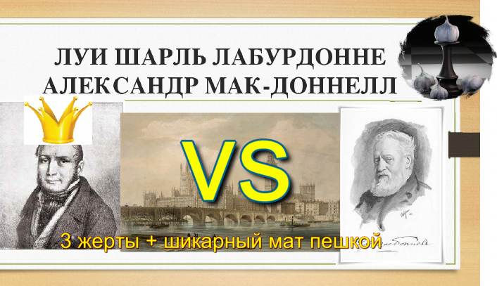 Изящная партия двух известнейших шахматистов XIX века: Луи Шарль Лабурдонне и Александр Мак Доннел, сыгранная в Лондоне в 1834 году Перед вами сделанный 20 ход черных. Мак Доннел был уверен, что делает хороший ход, вскрывая атаку на ферзя и одновременно атакуя ладью. Компьютер (точнее неглубокий анализ) с ним согласен. Но благодаря этому ходу Лабурдонне проводит серию атакующих выпадов с красивой победой. Попробуйте прочитать и предугадать действия белых и черных. Вся великолепная партия в видео ниже - смотрите с удовольствием