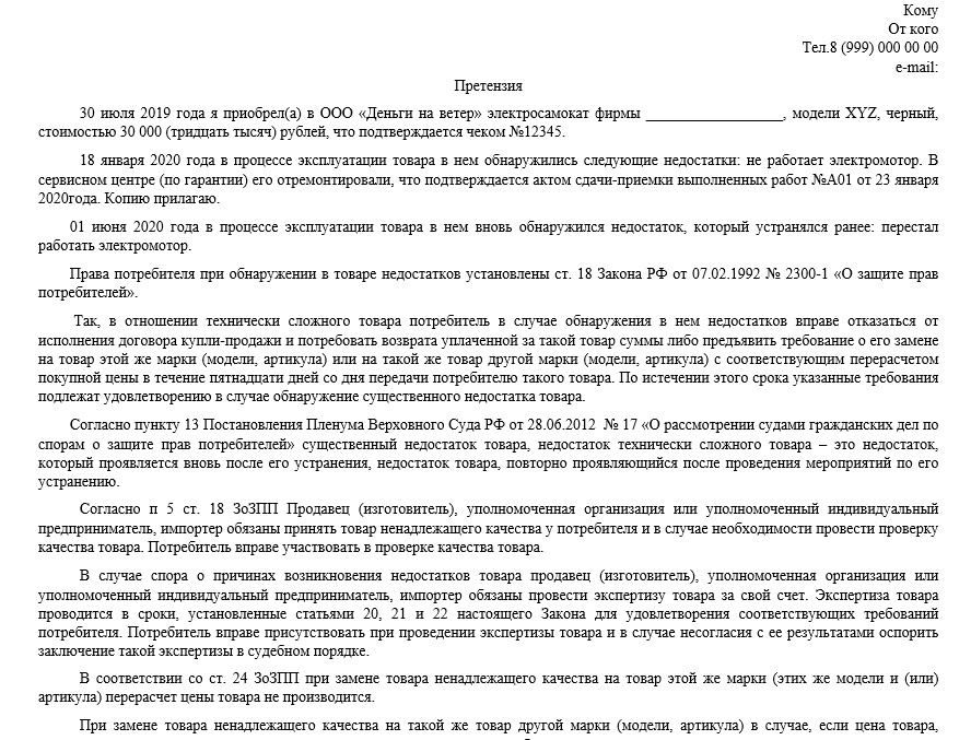 Подводя итог всему изложенному, размещаю образец претензии с требованием о замене товара, имеющего недостатки, на аналогичный новый. Чаще всего продавцы при обращении к ним хотят ограничиться гарантийным ремонтом товара, скрывают от покупателя его право на замену товара. Но, зная, когда Вы имеется право на получение абсолютно нового товара, Вы сможете защитить свои права.