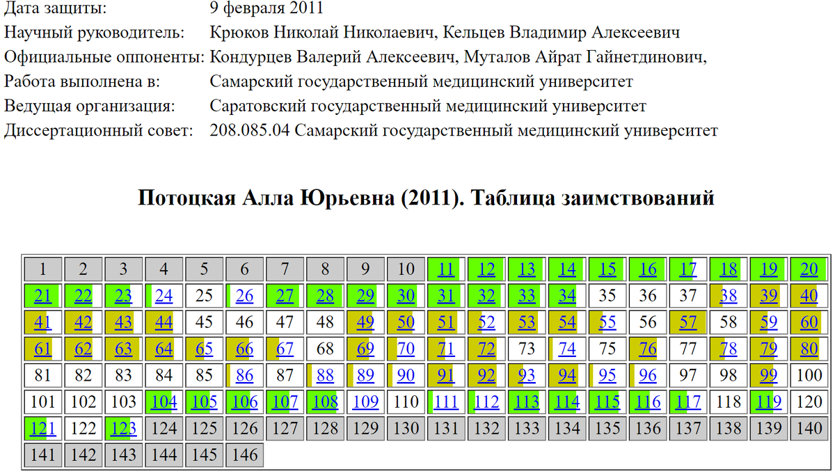 Что же пишет в своем заключении, диссертационный совет Д 208.085.05 при Самарском государственном медицинском университете (председатель — профессор Юрий Владимирович Щукин), тот самый совет, в котором под руководством профессора Владимира Алексеевича Кельцева и при оппонировании профессора Айрата Гайнетдиновича Муталова защищались все три персонажа. А вот что: «Совпадения являются самостоятельно сформулированными диссертантом положениями». Ну да, great minds think alike. Далее отмечается, что все три диссертантки работали в рамках одной кафедральной тематики и имеют совместные публикации (это правда, вот только суммарный объем этих публикаций куда меньше объема списанного материала). А дальше еще чудесное: «Поскольку во время написания диссертации не было каких-либо средств автоматизированной проверки, таких как система “Антиплагиат”, ни диссертационный совет, ни сам диссертант не имели возможности проверить совпадения указанных формулировок». То есть, по мнению диссертационного совета, без Антиплагиата диссертант не имеет возможности узнать, что он переписал несколько десятков страниц из диссертаций представителей своей же кафедры, руководитель не догадается, что его ученики тотально списывают друг у друга, а оппонент не может заметить, что он в очередной раз читает один и тот же текст и разглядывает те же рисунки.