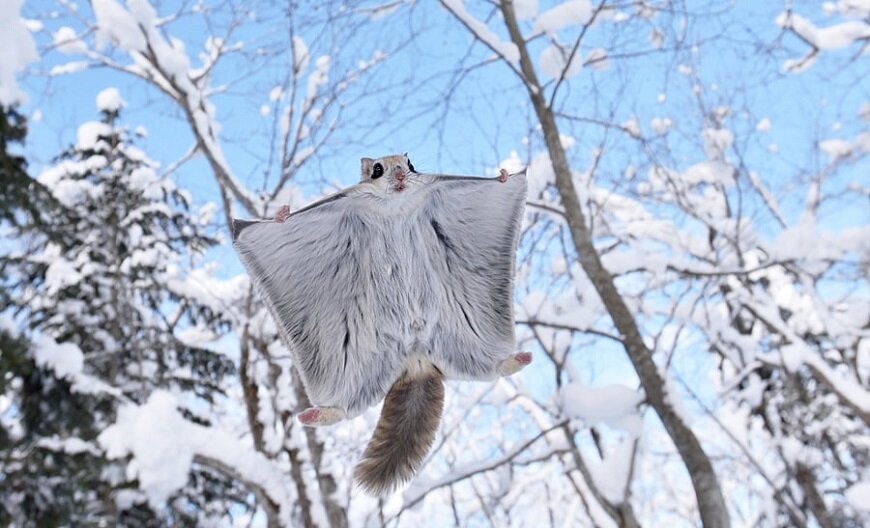 Белки водятся во всем мире. Но белку-летягу не часто можно встретить. В Сибири ее называют "летучая варежка". Неужели этот грызун может летать? Прыжки этих зверьков достигают 80 метров в длину ! Дело в том , что у летяг есть кожистая перепонка. В книге "Мир животных" говорится : "Передний край перепонки поддерживается хрящом или костью отходящими от запястья. Хотя на первый взгляд кажется, что перепонка состоит из кожи ,на самом деле в ней есть тонкий слой мышц, позволяющих зверькам изменять кривизну планирующей поверхности с учетом аэродинамических качеств ". В полете тело белки-летяги распластано и выглядит совершенно плоским. Когда белка сидит на ветке , то кажется, что она одета в шубку , которая на два размера больше , чем надо. Рулем им служит хвост. Прямо перед посадкой на ветку летяги раскрывают свой "тормозной парашют" переводя тело в вертикальное положение . Этот пушистый "дельтаплан" очень легкий. Весит в среднем 150 грамм и достигает в длину 20 сантиметров без хвоста