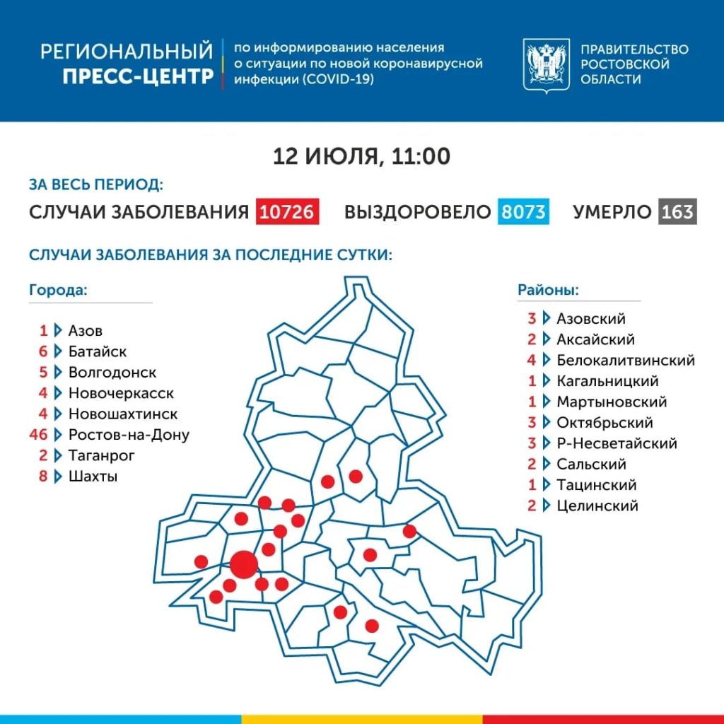 На Дону растёт число заболевших коронавирусом. За минувшие сутки COVID-19 в регионе подтвердили ещё у 98 человек. На утро 12 июля количество заражённых за все время достигло 10726. Отметим, что число заражённых за сутки не подбиралось так близко к сотне с 29 июня. В этот день впервые в Ростовской области зафиксировали двузначное число заражённых за 24 часа. Растёт в последние дни и коэффициент распространения инфекции. Вчера он впервые за долгое время превысил единицу. Показатель минувших суток – 1,02. Новых больных зарегистрировали в 18 городах и районах региона. Больше всего в Ростове-на-Дону (46), Шахтах (8) и Батайске (6). Жертвами вируса в Ростовской области стали 163 человека. За минувший день умерли еще двое: 69-летний мужчина и 79-летняя женщина. В больницах региона с диагнозом COVID-19 сейчас находятся 639 пациентов. В тяжелом состоянии на аппаратах ИВЛ – 33 человека. Несмотря на рост некоторых показателей, завтра в Ростовской области произойдёт очередное смягчение ограничений