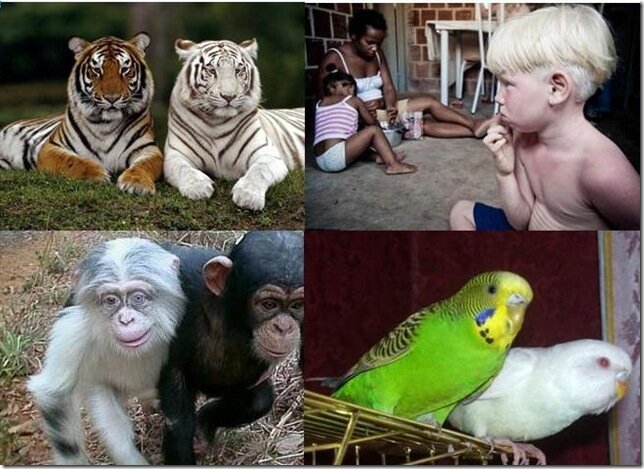 Выражение «белая ворона» давно уже стало метафорой, которая означает резкое отличие человека или животного от окружающих.«Белые вороны» встречаются среди многих видов животных. Такие особи получили название альбиносов, произошедшее от латинского слова «albeus», что в переводе означает «белый»Альбиносов можно отличить от прочих людей без всякого труда: белые волосы, бесцветные ресницы, прозрачно-бледная кожа, очки с толстенными стеклами и портативные телескопы в руках…По оценкам ученых в Европе приблизительно один из 20 тысяч человек является белокожим, светловолосым и красноглазым альбиносом. Однако кое-где альбиносы встречаются еще чаще. Например, вы не поверите, при обследовании 14 292 негритянских детей в Нигерии среди них оказалось пять альбиносов, что соответствует частоте около 1 на 3 000, а среди панамских индейцев (залив Сан-Блаз) частота составила 1 на 132!