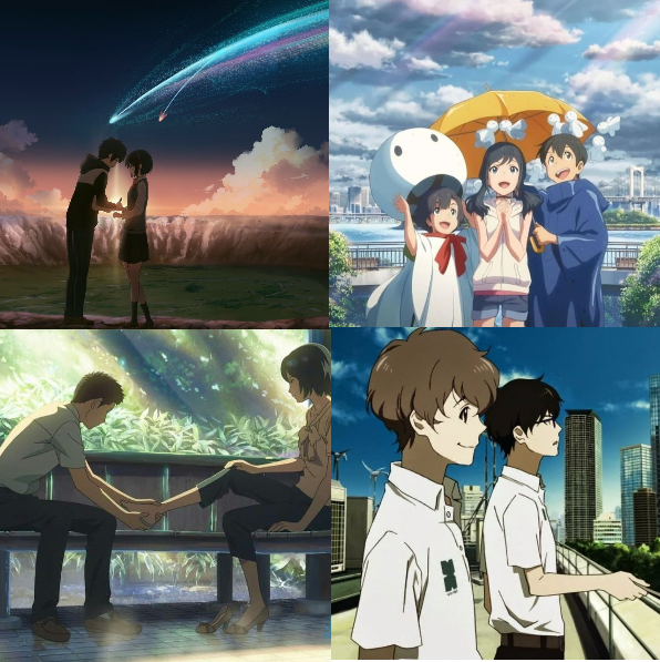 1. Твое имя (きみのなわ). История повествует на от лица двух людей. Мицуха Миядзима старшеклассница живущая в маленьком городе где то в горах. Ей приходится выполнять древние ритуалы пред всеми в их семейном храме. Мицуха мечтает перебраться в огромный город. И о Таке Татибане старшекласснике который живет в большом загруженном Токио, ему приходится работать на подставке официантом. В один день они просыпаются и меняются местами, проживая жизни друг друга. Но в один день они перестают меняться местами и Така Татибана решает, что найдет Мицуху во что бы то ни стало. Прекрасное аниме, которое обязательно к просмотру. 2. Дитя погоды (てんきのこ). Старшеклассник Ходака Морисима сбегает из дома и уплывает в большой город Токио. После нескольких дней у него заканчиваются деньги и он устраивается в офис, где пишут статьи в журнал о сверхъестественном. Однажды он встречает девушку Хино Аманэ, которая как оказывается имеет способность разгонять тучи помолившись дождю. Просто шикарное аниме, кто не смотре