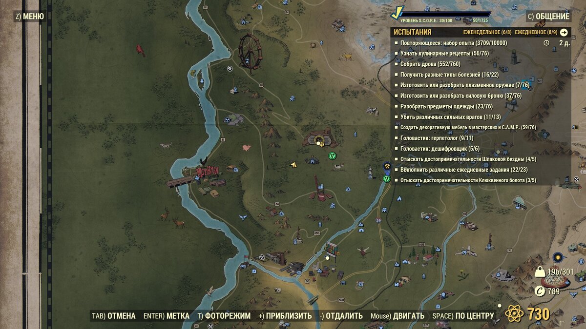 Привет! Полагаю, что многих, кто начинает играть Fallout 76, интересует вопрос — как же зарабатывать крышки? Пока вы будете проходить сюжет и побочные сюжетные задания, проблем с крышками особо не будет. Но вот после сюжетки, когда источник доходов закончится, вопрос с крышками встанет остро. Тем более, что когда вы откроете на карте множество локаций, быстрое перемещение между ними каждый раз будет отнимать 40-50 крышек за раз. К счастью, есть легальный способ поставить свой заработок на поток. Это добыча воды. Как организовать Для начала необходимо разместить свой лагерь у водоёма. Убедитесь, что достаточно большая зона строительства (не менее трети) попадает в водоём. Для достаточного количества промышленных станций нужно много места. Я размещаю свой лагерь здесь, недалеко от убежища 76. Так выглядит задний двор моего дома. Как видно, одновременно у меня работает 7 промышленных водоочистных установок. Схема установки может выпасть с какого-либо моба, также её иногда можно найти в пр