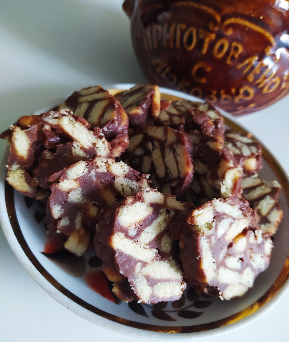 ➡️ Отправляем шоколадную колбаску в холодильник на несколько часов до застывания. Можно в морозилку, если хочется быстрее съесть)