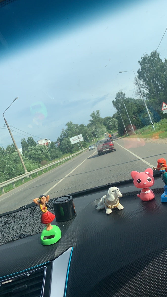 Друг подвозит до дома) прикольные игрушки в салоне, а так же отличная погодка))