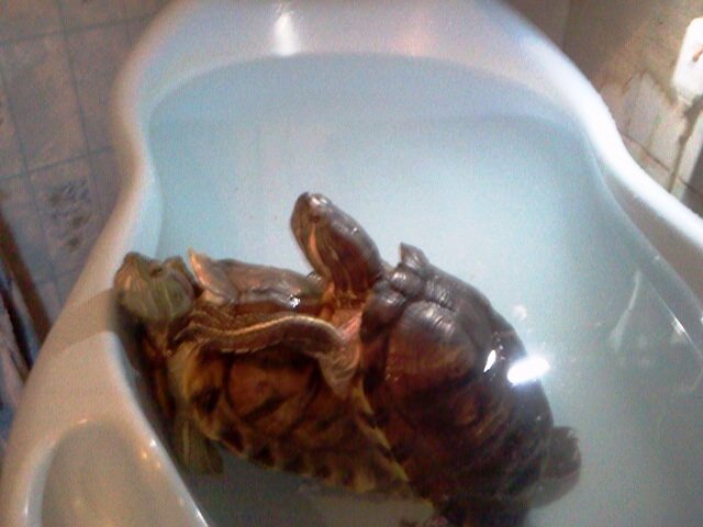 А это экзотические жители нашего зоодома..тоже были приобретены не по желанию, а по случаю ненужности прежним хозяевам..Красноухие черпашки Феодора – возраст около 5-ти лет и Истребитель – возраст около 8-ми лет. Забавные существа, но тоже требуют особого ухода. Они хищники! К сожалению в нашем городе пока пристроить в лучшие условия чем есть у нас дома не получается…