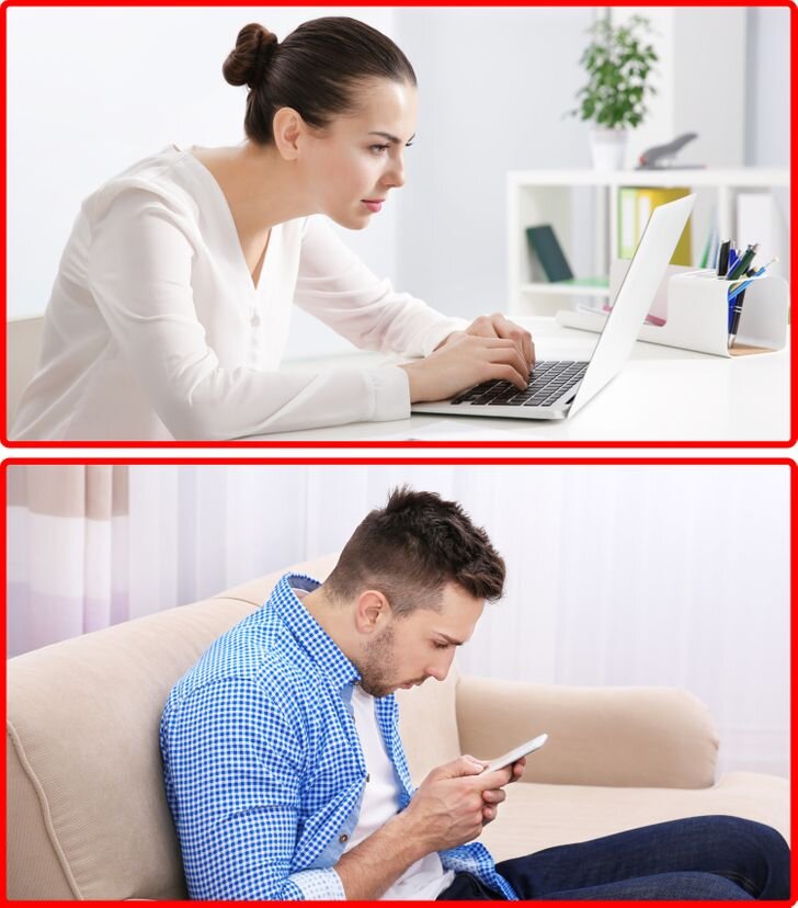 Девайсы и гаджеты наступают по всем фронтам. Перечень врачебных диагнозов не стал исключением. О синдроме компьютерной или текстовой шеи все чаще начали заговаривать отечественные доктора. За рубежом это патологическое состояние уже окрестили «эпидемиологической проблемой». Доктор медицины, специализирующийся на хирургии и реабилитации позвоночника, Кеннет Хансраи из Нью-Йорка начал всерьез исследовать проблему и пришел к весьма интересным выводам. В физиологически правильном вертикальном положении голова взрослого человека весит приблизительно 5 кг. Именно такой вес оказывает нагрузку на шейный и грудной отдел позвоночника. По мере того, как человек наклоняет и выдвигает вперед голову (а именно такое положение тела обычно принимают люди, сидя за компьютером или листая новости на своем телефоне) нагрузка на позвоночник стремительно возрастает: · Наклоняя голову на 15°, нагрузка возрастает до 12 кг. · При наклоне в 45° весовая нагрузка на позвоночный столб составляет уже 22 кг. · Нак