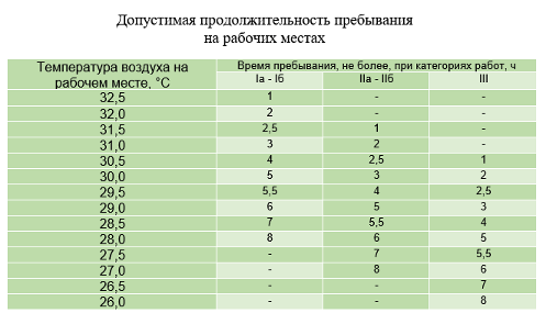 ВНИМАНИЕ! Согласно нормам СанПин при превышении температуры на рабочем месте 32.5 градусов время пребывания на рабочем месте не предусмотрено. В таком случае работодатель должен объявить день выходным и оплатить время простоя согласно ст. 157 ТК РФ.