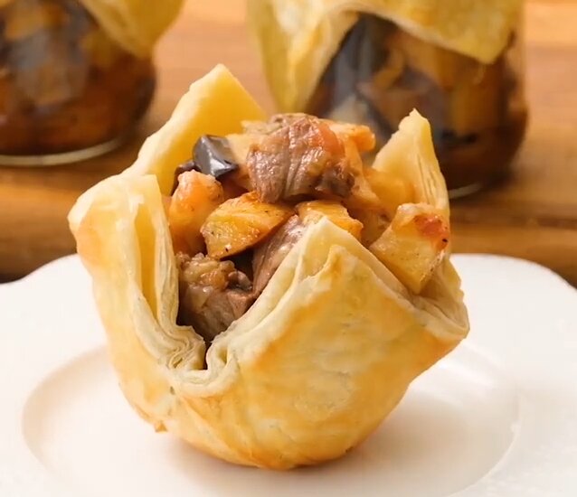 Доброго времени суток, дорогие читатели моего канала. Нашла в интернете один интересный рецепт выпечки, где начинка может быть любая. Используют пол-литровые банки для того, чтобы придать форму корзинки из теста. Начинку для такой креативной выпечки будем готовить сразу. Возможно у вас отличная духовка и начинка приготовится вместе с тестом в одно время. Интересный факт, что в такой выпечки у Вас никогда не подгорит дно теста. У меня такое иногда случалось, только на секунду отвернешься как тут все и сгорело. Корзинки с начинкой в банках Ингредиенты: Рецепт слоеных корзинок с начинкой по-домашнему Мясо нарезаем кубиками и обжариваем в небольшом кол-ве масла. Нарезаем три картофеля кубиками Тоже проделываем и с баклажанами Картофель и баклажаны обжариваем во фритюре В сковороду наливаем масло и обжариваем лучок и помидор, с добавлением томатной пасты. Добавляем готовое мясо Добавляем картофель Добавляем баклажаны. Солим и перчим Распределяем готовую начинку по банкам. Тесто раскатываем
