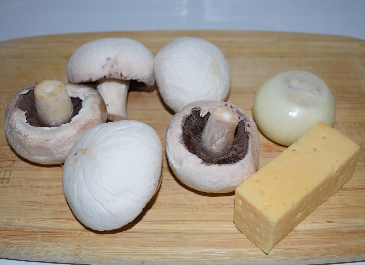 Дорогие друзья! Сегодня у меня для вас очень простая закуска или даже, я бы сказала, полноценное блюдо. Все очень быстро и вкусно. А главное, никакого майонеза и соли! Фаршированные шампиньоны это прекрасный вариант для праздничного стола! А вот несколько фактов о шампиньонах: Сплошная польза! Хоть сырыми ешь. Но их, действительно, можно есть сырыми, и это тоже вкусно. Но вернемся к блюду! Ингредиенты: Готовится это блюдо проще некуда. Лук режем и отправляем жариться на сковороду. Пока лук жарится, займемся грибами. Для начала шампиньоны надо очистить от загрязнений. Я снимаю верхнюю кожицу и они становятся чистенькими. Затем вырезаем ножки. Шляпки пока оставим в покое, а вот ножки надо будет порезать. Лук уже стал золотистым. Отправляем к нему нарезанные ножки грибов. Жарится все очень быстро. Главное, чтобы не подгорело! Тем временем, натираем сыр на мелкой терке. И когда лук с ножками немного остынут, добавляем их к сыру. И перемешиваем. Совет. Не надо ждать полного остывания зажар