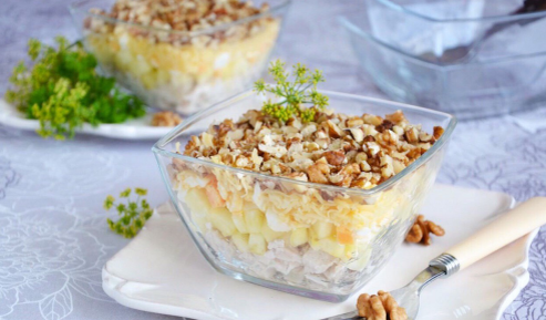 Очень необыкновенный салат для любого застолья! Ананасы облегчают вкус салата, делают его сочным. А их сладость отлично гармонирует с остальными ингредиентами. Ингредиенты: - куриное филе 200 гр. - твердый сыр 100 гр. - ананасы консерв 120 гр. - грецкие орехи по вкусу - свежая зелень 3-4 веточки - соль 3 щепотки - специи 3 щепотки - майонез 2 ст.л. Приготовление: 1) Куриное мясо отварить, нарезать кубиком, выложить первым слоем и смазать майонезом. 2) Ананасы также нарезать мелкими кубиками и выложить сверху на куриное филе, утрамбовать. Здесь майонезная сетка не нужна. 3) Сыр натереть на крупной терке, выложить сверху на ананасы и сделать слой из майонеза. 4) Салат посыпать измельчёнными грецкими орехами, украсить свежей зеленью и убрать блюдо в холодильник для пропитки. На это лучше отвести час-полтора. Приятного аппетита!