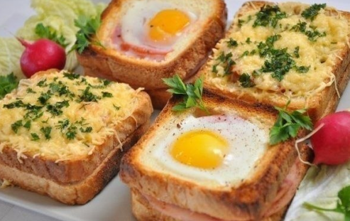 Вам потребуется: - 16 кусочков белого хлеба. - 8 пластин ветчины. - 1-2 помидора. - 200 г грибов. - 4 яйца. - 100-150 г сыра. - 1 ст. ложка сливочного масла для обжарки. - соль, перец, зелень петрушки. Способ приготовления: Из 8 кусков хлеба острым ножом вырезать мякиш. Получатся хлебные «ободки» из корочек. 8 целых кусочков хлеба выложить на противень, на 4 из них положить хлебные «ободки». Заполнить их заранее обжаренными грибами, посолить, поперчить и посыпать тертым сыром. На остальные 4 кусочка хлеба положить по 2 пластинки ветчины, на них – оставшиеся 4 хлебных «ободка» без мякиша. Внутрь ободков положить нарезанные кружочки помидоров и разбить в каждый бутерброд по яйцу. Посолить, поперчить. Отправить противень с бутербродами в нагретую духовку и запекать при 180 С, пока не «схватятся» яйца и не расплавится сыр. Приятного завтрака!