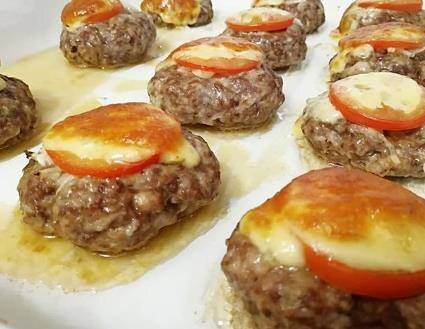 Из фарша сформируйте котлеты, в середине сделайте углубление, чтобы получилось похоже на гнездо. В каждое углубление положите лук, сверху томат, потом кусочек сыра.