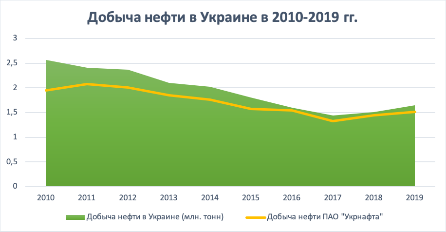 График 1. Добыча нефти на месторождениях Украины в 2010-2019 гг. (в млн тонн в год). Источник: Министерство энергетики и угольной промышленности Украины.
