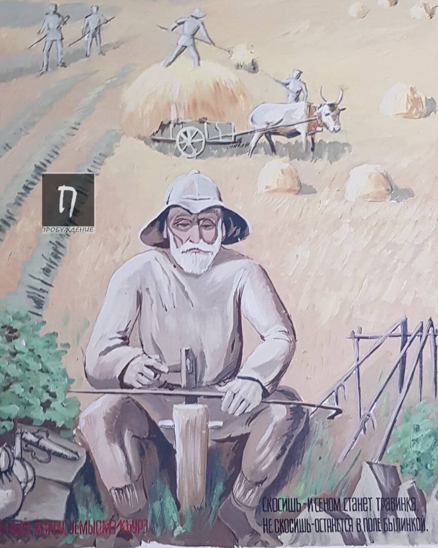 Советский плакат. Адыгский крестьянин на фоне сенокоса. Картина сопровождается пословицей: "Уеомэ мэкъу, уемыомэ къурэ" - "Скосишь - и сеном станет травинка, не скосишь - останется в поле былинкой".