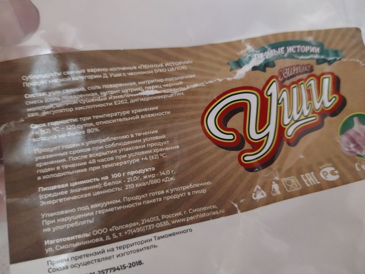 Вы не поверите, но я никогда не ела свиных ушей. Да, да, я существую) Но решено было собраться посидеть компанией и попить недорого пива. А что является хорошей закуской к пиву? Правильно, рыбка)) Но друзья принесли с собой вот такие вот уши. Точнее сказать, одно целое, запечатанное ухо, которое смотрело на меня через упаковку. А я на него....А оно на меня.... Состав неплох: ухо собственно, перец, соль, ну и немного консервантов. Режем) Ууух, я впечатлена. Выглядит вкусно. Запах изумительный, подкопченная свининка благоухала на кухне. Есть мясо на срезе. Хрящики белые. Самое главное, что нет волос. Производитель их заботливо удалил. Вообщем красота! Цена не плохая. Я как то в кафешке в меню видела ухо по 400 рублей на гриле. А здесь подкопченое. Так что разница не велика. Как хорошо что не я его купила с моими то финансами)) Вы знаете, мне понравилось. Необычно, тает во рту, а для человека никогда не евшего свиные уши это был праздник)) Фото с пивом не покажу) яндекс заблокирует.)