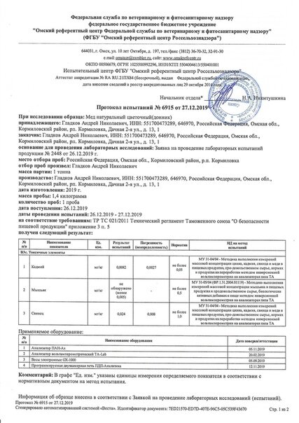 У меня только пчелы Карпатки, только новые выводки, весенние, не зимовавшие, только здоровые пчелы работают. В итоге все написано в протоколе: в составе сахара нет, послевкусие не приторное, диастаза зашкаливает (а это самое ценное в меде). В южном меде нет такой диастазы, там растения цветут долго, а у нас, в Сибири, растения более концентрированную пыльцу дают, в этом и ценность. Карпатки хорошую диастазу закладывают сами.