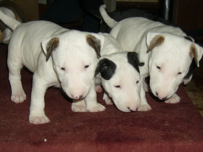 Но как-то раз знакомой надо было куда-то уехать и она попросила подержать некоторое время щенков. Бультерьерцев. Надо так надо. Так у нас в доме появились три поросёнка. Белые и очень жизнерадостные. Целыми днями носились по дому, грызли всё, что попадалось под руку зубы, открывали все двери. И я не подозревал, что в этой