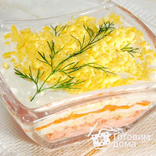 ИНГРЕДИЕНТЫ рыбные консервы (лосось или сайра)1 банка (консервы можно заменить ~200 г отварной форели) морковь (отварная)1-2 шт яйца отварные4-5 шт лук репчатый 0,5 шт майонез зелень укропа для украшения соль свежемолотый перец Пошаговый рецепт с фото С рыбных консервов слить жидкость и размять консервы вилкой (отварную форель разобрать на небольшие кусочки или размять вилкой).