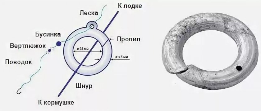 Посмотрите видеоотчёт к статье : Здравствуйте.Сегодня хотелось бы поговорить о такой оснастке ,как кольцо.Применяется при ловле белой рыбы на реке с лодки. Итак что же она из себя представляет. Снасть практически повторяет классический фидерный монтаж инлайн. То есть принцип практически одинаков.Леска свободно скользит сквозь ушко кольца или карабина фидерной кормушки.Дальше начинаются различные нюансы исполнения,которые непосредственно влияют на функциональность оснастки. Итак начнем с кольца. На рисунке представлен классический монтаж кольца. Шнур -1 привязывается к борту лодки одним концом и к кормушке другим .Кормушка может быть исполнена как металлическая банка с отверстиями для выхода прикормки или как сетчатый мешок.Отверстия в кормушке подобраны таким образом ,чтобы прикормка постепенно вымывалась . Объем кормушки таков ,что его хватает до конца рыбалки. Вытаскивать кормушку для перезарядки не надо. По шнуру свободно ходит свинцовое кольцо .На рисунке -2. В кольце имеется про