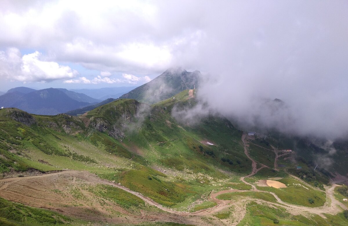 На Роза Хутор из Имеретинки можно добраться на автобусе или на скоростном поезде "Ласточка". Мы выбрали последнее. Это дороже чем на автобусе, но быстрее и комфортнее. Отправлялись мы с вокзала Олимпийский парк. Из окна электрички очень красивые виды. Всю дорогу нас сопровождала горная река Мзымта. Внутри вагона прохладно, работает кондиционер. Примерно через 40 минут мы прибыли на конечную станцию Роза Хутор. На вокзале Роза Хутор нас встретил гид. Он предложил купить билеты на подъёмник прямо в здании вокзала и пройти в автобус, который бесплатно довозит до курорта. Ехали минут пять. Затем этот же гид провёл короткую (10 - 15 минут) и информативную экскурсию по долине и показал, где находится подъёмник. И вот мы начинаем подниматься. Кабинка удобная. Чем выше, тем сильнее закладывает уши. Но какая красота открывается! Чтобы добраться до Роза Пик, нужно сделать две пересадки. На остановках мы не задерживались. Хотелось попасть на вершину, пока погода была хорошая. Мы на Роза Пик!