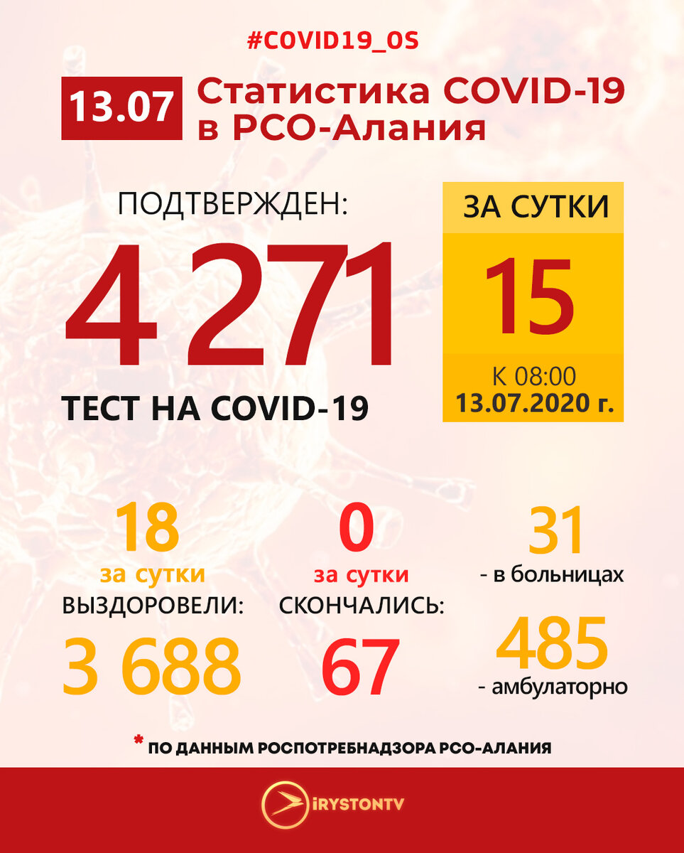 4 271 (15 за сутки) положительный тест на COVID-19 подтвержден к 13 июля 08:00 (Мск) по данным Роспотребнадзора РСО-Алания.