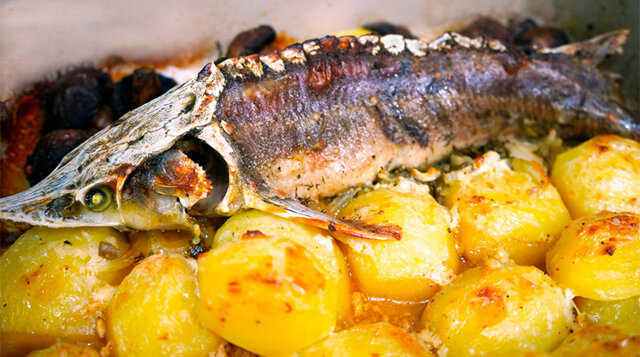 Промыть рыбу под проточной водой. Далее необходимо стерлядь обдать кипятком (данная процедура позволит быстрее избавиться от слизи и облегчит чистку рыбы). Соскоблить слизь и чешуйки с брюшка и боков рыбы. Хорошо промыть рыбу под проточной водой. Удалить внутренности, пленки, хрящи с хребта (удаление хорды обязательно) и жабры. Еще раз промойте стерлядь под водой. Очистить картофель и поставить отвариваться. Как вода закипит, варить картофель 5 минут. Отключить огонь, слить воду и оставить остывать. Смесь для рыбного маринада: Натираем цедру лимона (1 шт.) и добавляем: оливковое масло (2 ст.л.), соль (2 ч.л.), черный свежемолотый перец (примерно 1/2 ч.л.), кориандр ( 1 ч.л.) и сок лимона (1 ст.л.). Нарезаем лук полукольцами. Укладываем лук в емкость для запекания. Укладываем на лук стерлядь и обмазываем ее полученной смесью специй. Маринад для шампиньонов: Сбрызнуть грибы маслом, посолить, выдавить 1 зубчик чеснока и добавить паприку (1-2 ч.л.). Обтереть грибы полученной смесью специй