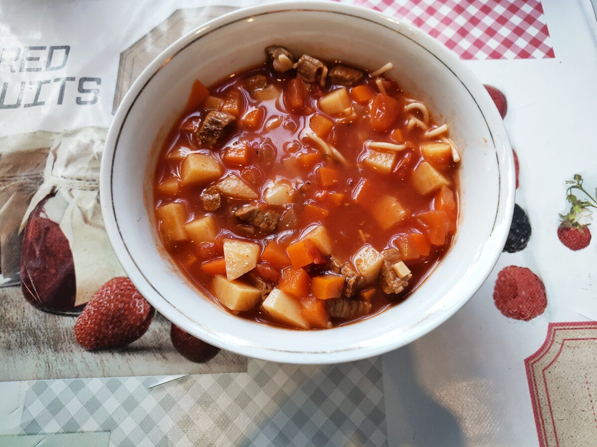 Вам понадобится: - говядина 200-300 гр.; - лапша ½ упаковки; - картофель 3-4 шт.; - морковь 1 шт.; - лук 1 шт.; - помидор 1 шт.; - томатная паста 2-3 ст. л.; - соль, перец по вкусу; - свежая зелень по вкусу. Мясо, картофель, помидор и морковь нарезать мелкими кубиками. Обжарить мясо до корочки, добавить лук, затем морковь и томат. Потушить. Сложить приготовленную зажарку в кастрюлю, добавить картофель, томатную пасту, соль, перец. Залить водой как суп.