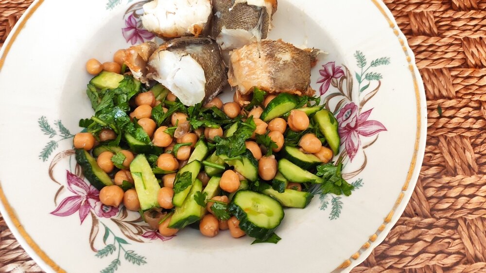 Первый раз когда сделала этот постный салат с нутом и огурцами, и подала его к протушенной на сковороде рыбке (у меня в этот раз хек) - осталась очень довольной! И потом сказала себе - нут теперь станет моим любимым! С ним и суп вкусный, и в салаты его добавлять можно, притом с разными ингредиентами, с картошкой и сметаной вместо мяса приготовить. В общем, вариантов море, советую присмотреться к этом чудесному дару природы. К тому же - нут очень полезный, и когда будут его варить - не выливайте юшку, это кладезь полезностей выпить ее, или в другое блюдо добавить можно. Ингредиенты: стакан нута; огурцы; зелень; соль; лимон; орегано; масло растительное. Для любого блюда нут изначально нужно залить водой на ночь. затем воду слить, промыть его и поставить варить часа на 2. За полчаса до конца варки присолить. Все, после этого из него можно делать, что угодно. Я делаю салатик: К нуту добавляю нарезанный огурчики, зелень, можно зубок чеснока, соль, масло растительное, сушеный орегано и