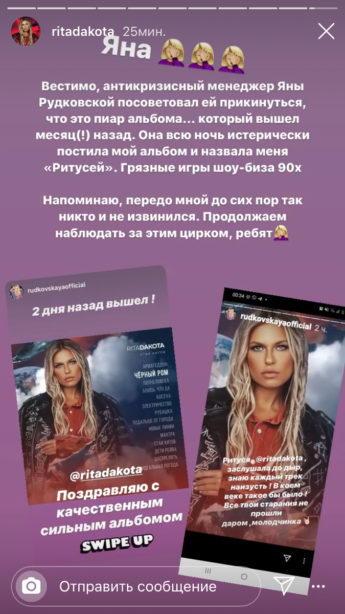 Не успели мы толком порассуждать на тему того, кто решил хайпануть на скандале Яне Рудковской и Риты Дакоты: Рудковская отдельно, или вместе с певицей продвинуть ее альбом, или отдельно Рита. Но, певица внесла ясность. Как оказалось, Янка пробила третье дно: - сначала она унизила певицу из-за ее доходов, мол нищебродка она и нефиг тереться возле бренда ЛВ; Как бы сказал Навальный: «Она Вам не Ритуся». Вот так вот. Что думаете по этому поводу? Пишите в комменты.