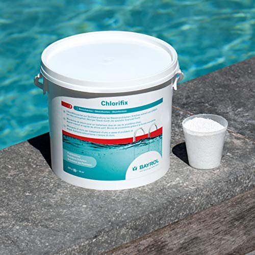 Преимущества: «Хлорификс» не содержит извести, РН-нейтрален, может применяться при любой жесткости воды, растворяется без остатка. Описание продукта: Быстрорастворимые хлорсодержащие гранулы. Рекомендации по использованию: Условием для эффективного хлорирования воды является поддержание значения РН воды в бассейне 7,0 - 7,4 при помощи средств «РН-минус» или «РН-плюс». Дозировка: Первоначальная: 50 гр. на 10 м³ воды бассейна. Еженедельная: 50 гр. на 10 м³ воды бассейна. Мутная вода/Ударная доза: 200 гр. на 10 м³ воды бассейна, затем 250 мл. «Дезальгин» на 10 м³ воды бассейна. При этом содержание свободного хлора в воде бассейна после обработки должно составлять 0,3-0,6 гр./л. (определяется по тестеру). Применение: Обработку лучше всего производить вечером. Для того чтоб избежать опасности обесцвечивания внутреннего покрытия бассейна (хлор агрессивен к покрытиям), можно растворить гранулы в емкости с водой, размешать до полного растворения и ввести в воду бассейна вблизи форсунок возврат