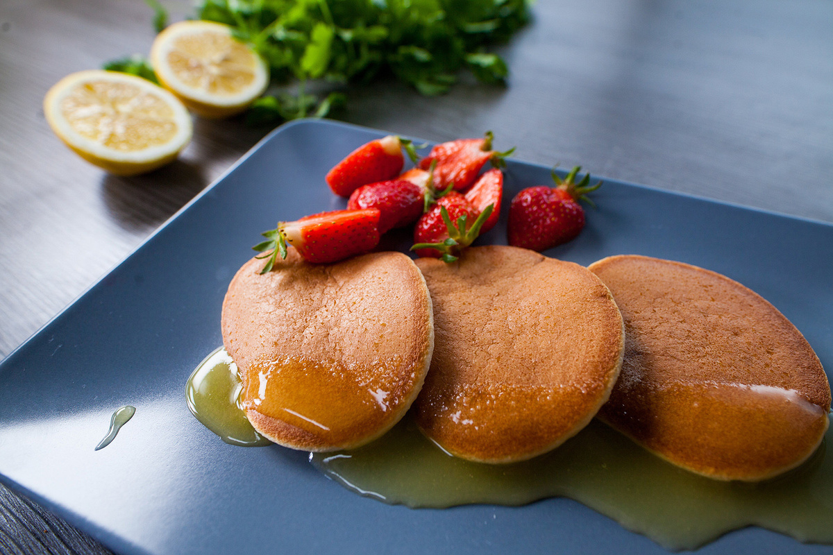 Переложить оладьи на порционные тарелки, полить сверху мёдом и украсить клубникой.