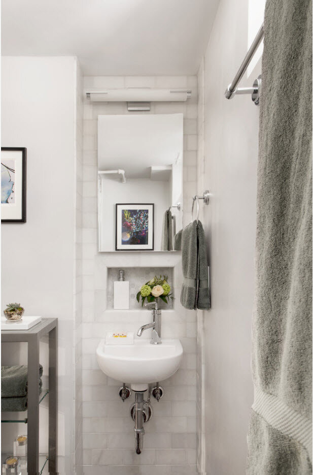 Россияне, привыкшие к необходимости оформления маленьких утилитарных помещений прекрасно знают, что светлые оттенки помогут оформить скромную по площади ванную комнату не только с привнесением легкости и свежести в интерьер, но и визуальным расширением пространства. Для большинства из нас именно белый цвет является символом чистоты и свежести, которые так необходимы в помещении для водных и санитарно-гигиенических процедур. Но не стоит зацикливаться на светлых поверхностях только из-за того, что ванная комната имеет скромные размеры. Цветовые акценты также необходимы, чтобы избавить всех домочадцев от стойких ассоциаций с больничной палатой или операционной, в которой, безусловно, чисто и даже стерильно, но абсолютно неуютно. Обилие белых поверхностей всегда создает несколько прохладную атмосферу помещения. Это могут быть фасады систем хранения, имитация дерева на керамической плитке, которая используется для отделки полов или оформления фартука над ванной, мойкой. Помимо белого цве